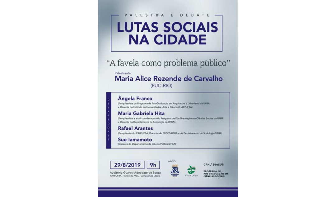 O Departamento de Sociologia e o Programa de Pós-Graduação em Ciências Sociais, juntamente com os pesquisadores do EdoSUB, da UFBA, organizaram o debate Lutas Sociais na Cidade, no dia 29/08/2019.
